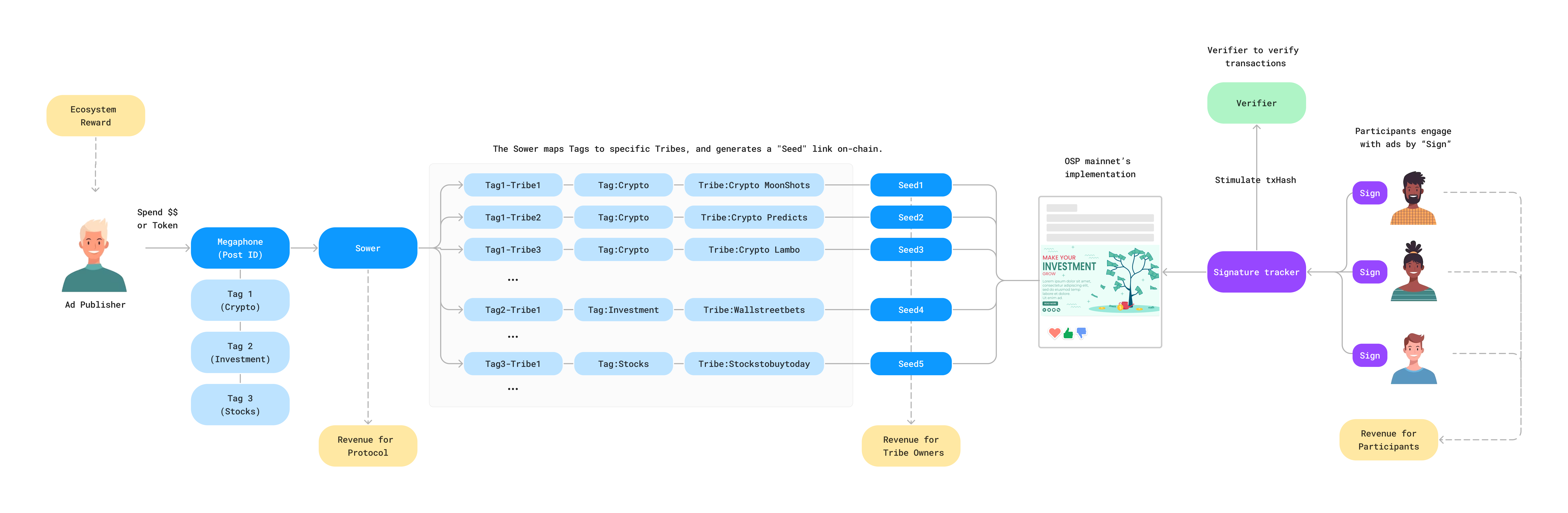 Since each Tribe has specific tags, the Sower is able to map the chosen tags by ad publisher to specific Tribes. For each Tribe mapped by the tags, a “seed” link will be generated. Then, the seed will be deployed to the OpenSocial mainnet so that the post will appear in the Megaphone section of these specific Tribes. Tribe users can then engage with the Megaphone post to earn rewards. While the Megaphone post is on-chain, engagement with the post can be either on-chain or off-chain.&#x20;