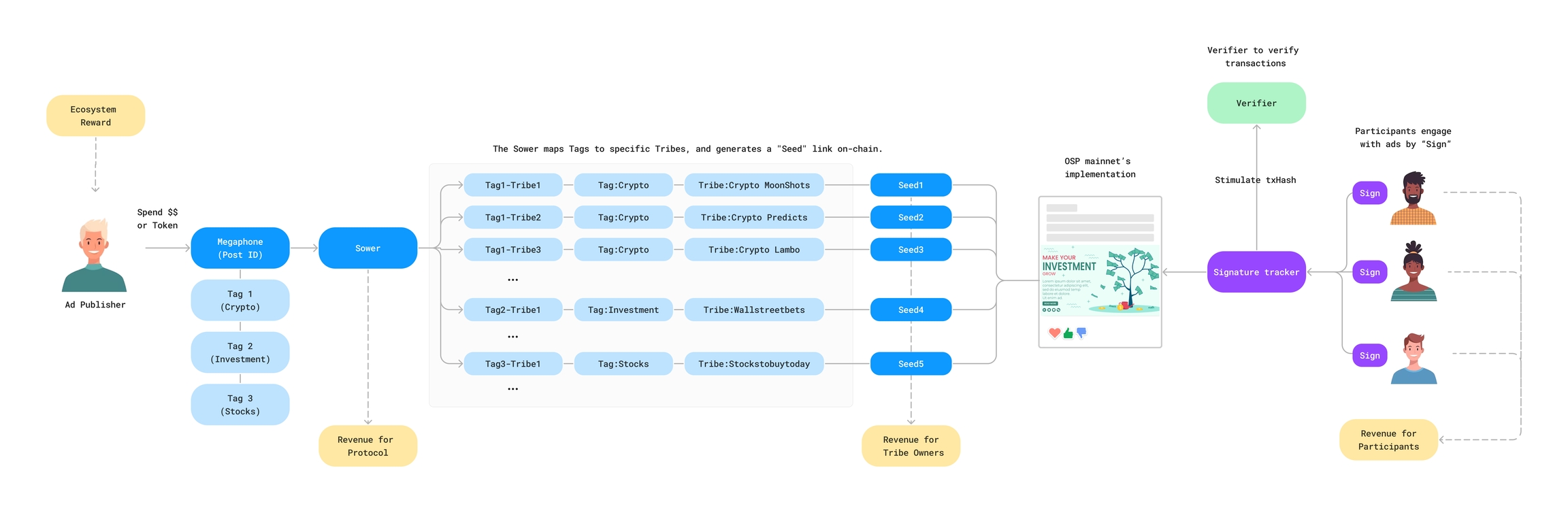 Since each Tribe has specific tags, the Sower is able to map the chosen tags by ad publisher to specific Tribes. For each Tribe mapped by the tags, a “seed” link will be generated. Then, the seed will be deployed to the OpenSocial mainnet so that the post will appear in the Megaphone section of these specific Tribes. Tribe users can then engage with the Megaphone post to earn rewards. While the Megaphone post is on-chain, engagement with the post can be either on-chain or off-chain.